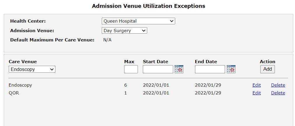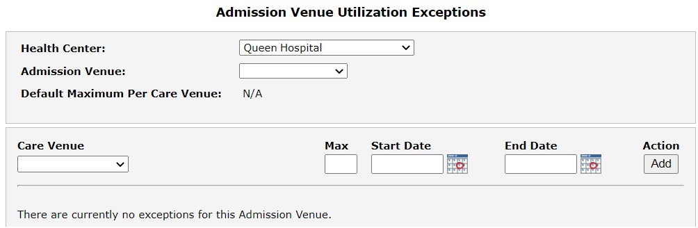 Select Admission Venue Utilization from Utilization in the Care Venue navigation menu to open the Admission Venue Utilization Exceptions page.