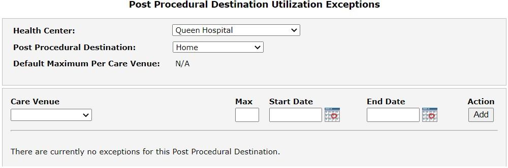 Select Post Procedural Destination Utilization from Utilization in the Care Venue navigation menu to open the Post Procedural Destination Utilization Exceptions page.