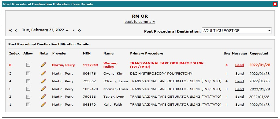 You have the option of clicking on a link for the given Admission Type / Post Procedure Destination to get a complete list of all cases of that type for the date in question. The list shows Order Received Index, Provider, Patient Name, Procedure, and Priority Score.