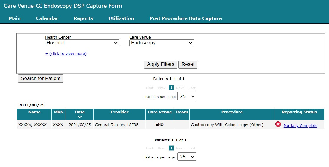 You may search for cases with post procedural data capture (both complete and incomplete) by clicking Search for Patient. This opens the Patient Search dialog.