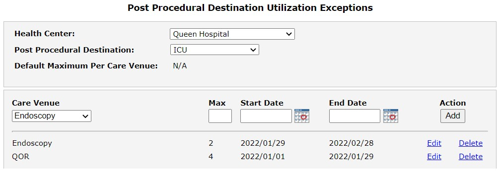 The Bed Utilization icon and the utilization exception reports are dependent on the existence of maximums for some or all admission venues/care venue and post procedure destinations/care venue combinations, depending on your needs.