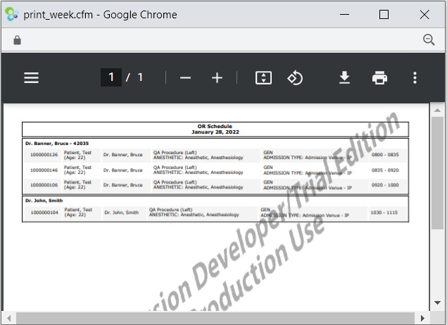 You can print the OR schedule for a day or a block, depending on where you are and what you need. When you choose to print the day’s OR schedule, the schedule appears as a PDF document in a dialog. You can download the PDF file or print it.
