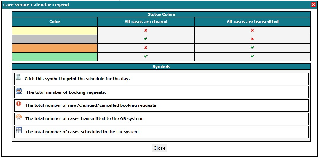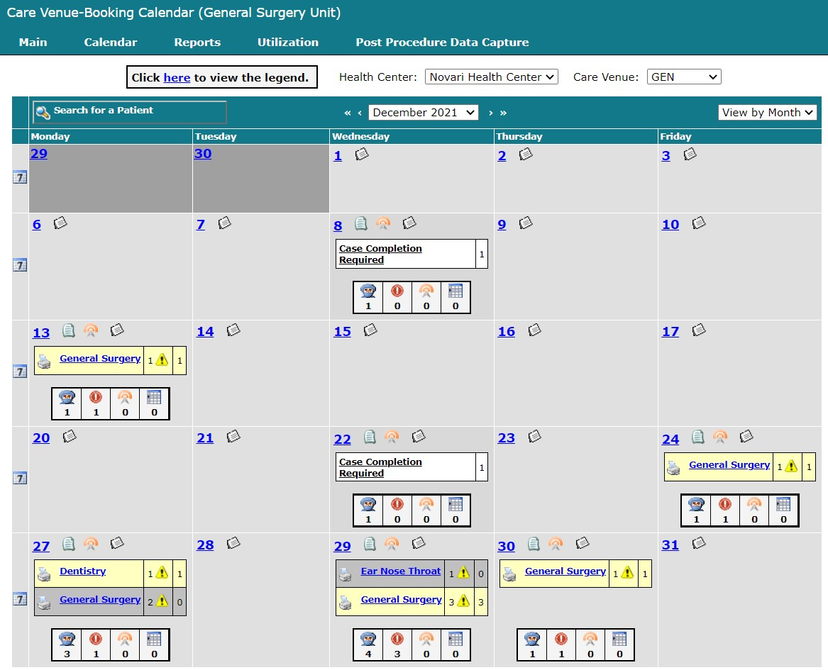 Care Venue Booking Calendar, both Month View and Week View, contains information about which surgery blocks are scheduled for each day and the status of the cases in each surgery block. Information is conveyed using colours and icons.