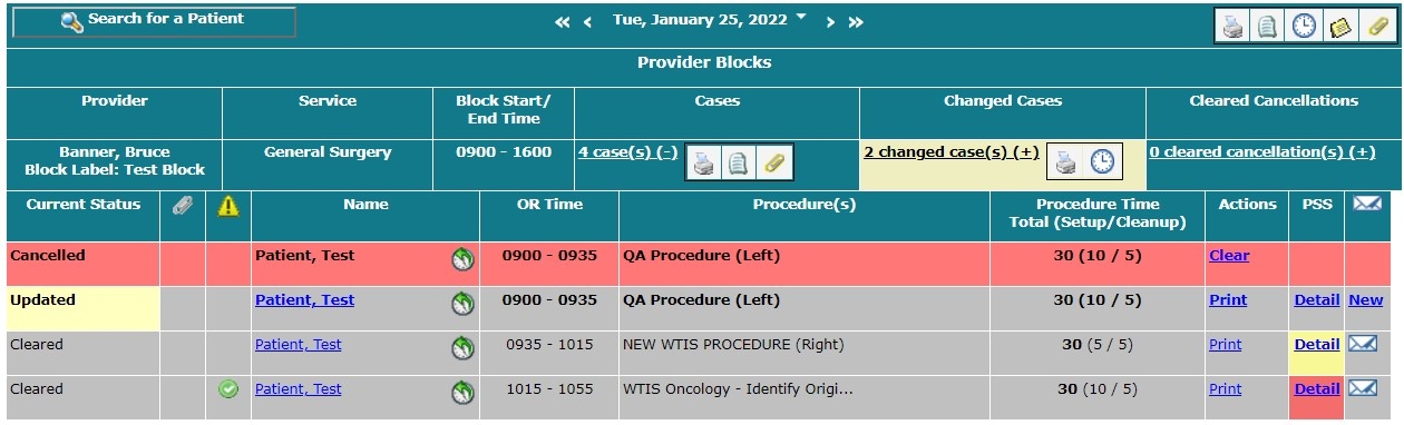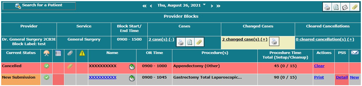 If a provider service appears on a yellow or orange background, the service contains one or more bookings with uncleared changes. An uncleared change could represent a new incoming booking request, changes to an existing booking request, or cancellation of an existing booking request. The difference between yellow and orange services is that yellow services also contain booking requests that have yet to be transmitted to the OR system.