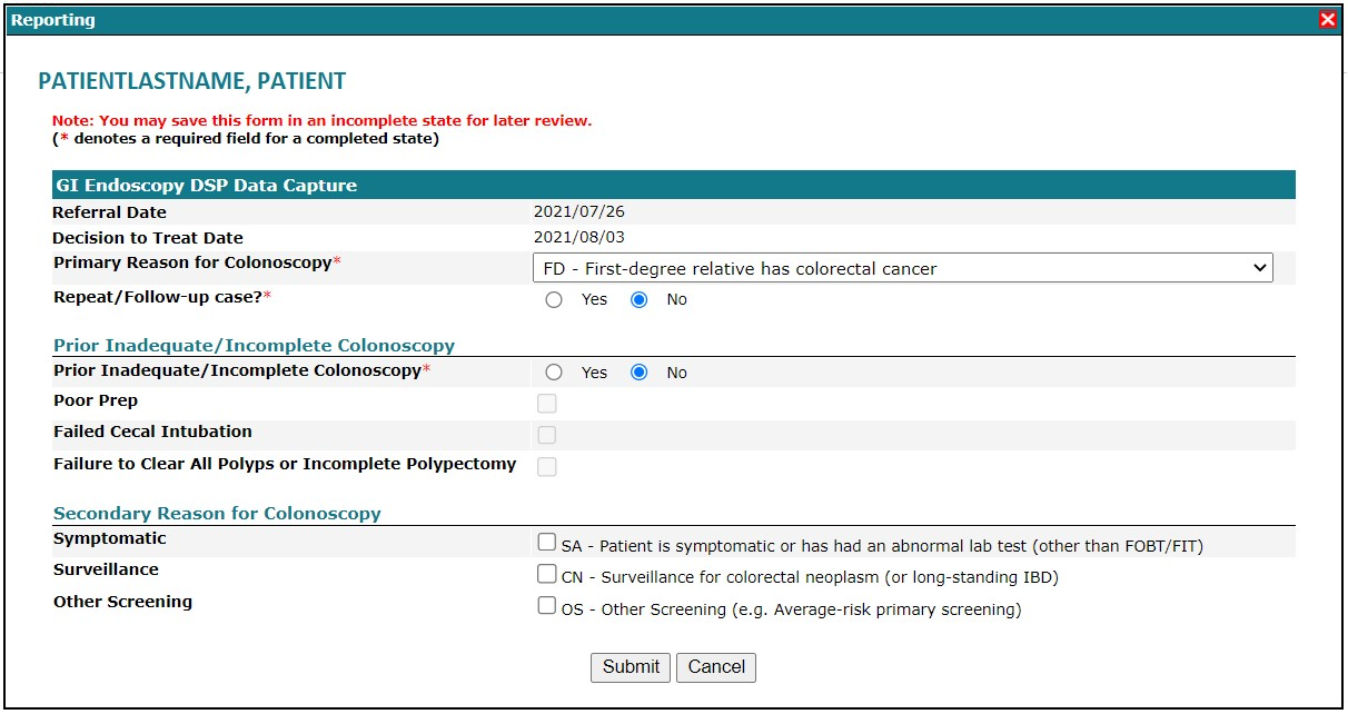 A GI Endoscopy DSP Data Capture dialog that was partially saved and automatically populated with the saved data.