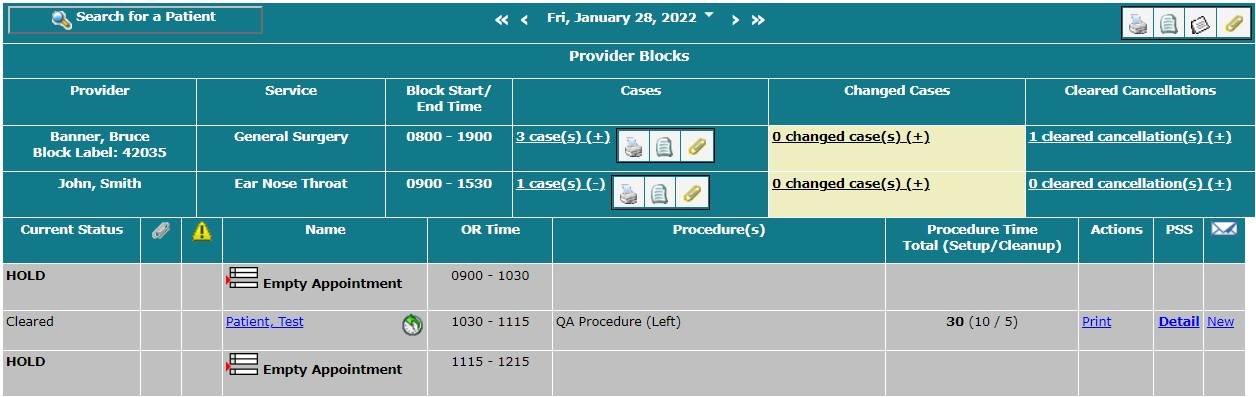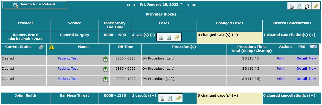 OR schedule for a day that shows the scheduled cases for two blocks. To print the OR schedule for the day from Month View,