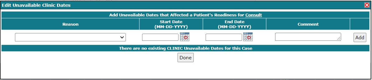 Add/edit unavailable dates that affect a patient’s readiness for Consult.