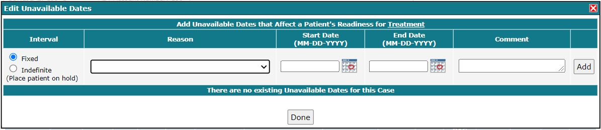 Add/edit unavailable dates that affect a patient’s readiness for Treatment.