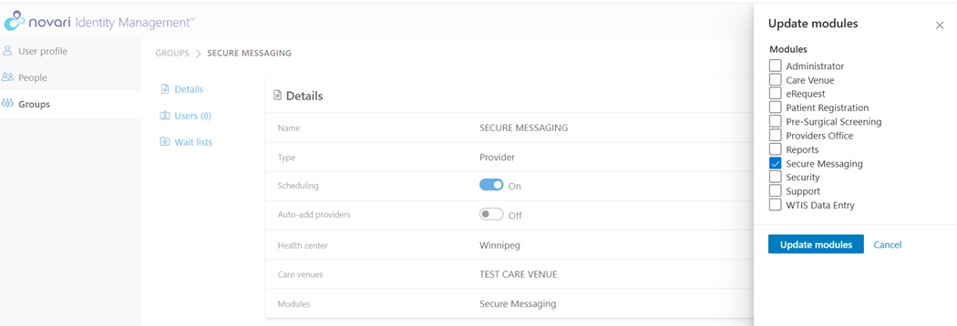 The Novari ATC site administrator enables Secure Messaging for a health center using groups in the Security module or in Identity Management module, depending on how your organization is set up.