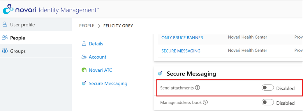 | For organizations using Novari ATC Security module to manage their users and group and Novari Identity Management for users to manage their accounts (hybrid model): YOU MUST CONTACT NOVARI HEALTH SUPPORT TO ENABLE THE SEND ATTACHMENTS PERMISSION FOR YOUR USERS. |