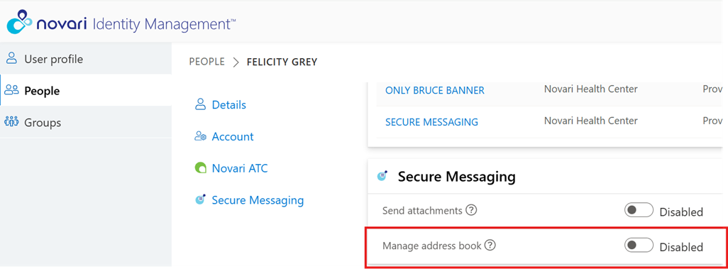 | For organizations using Novari ATC Security module to manage their users and group and Novari Identity Management for users to manage their accounts (hybrid model): YOU MUST CONTACT NOVARI HEALTH SUPPORT TO ENABLE THE SECURE MESSAGING MANAGE ADDRESS BOOK PERMISSION FOR YOUR USERS. |