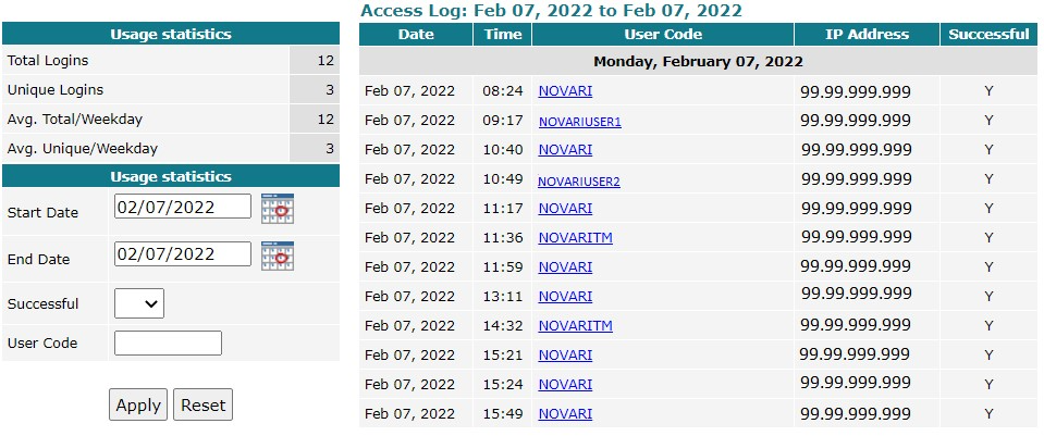For each login, you can see the date, time, the user code, the IP the user logged in from and if the login attempt was successful.