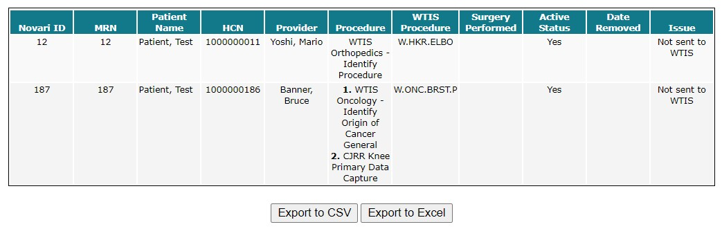 This report providers demographic and clinical information for WTIS reportable cases. Most notable is the procedure, the procedure category and the WTIS code that has been assigned to the case and transmitted to WTIS for reporting.