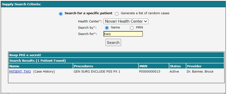 In the search results, click the patient’s name to view the patient’s case history.
