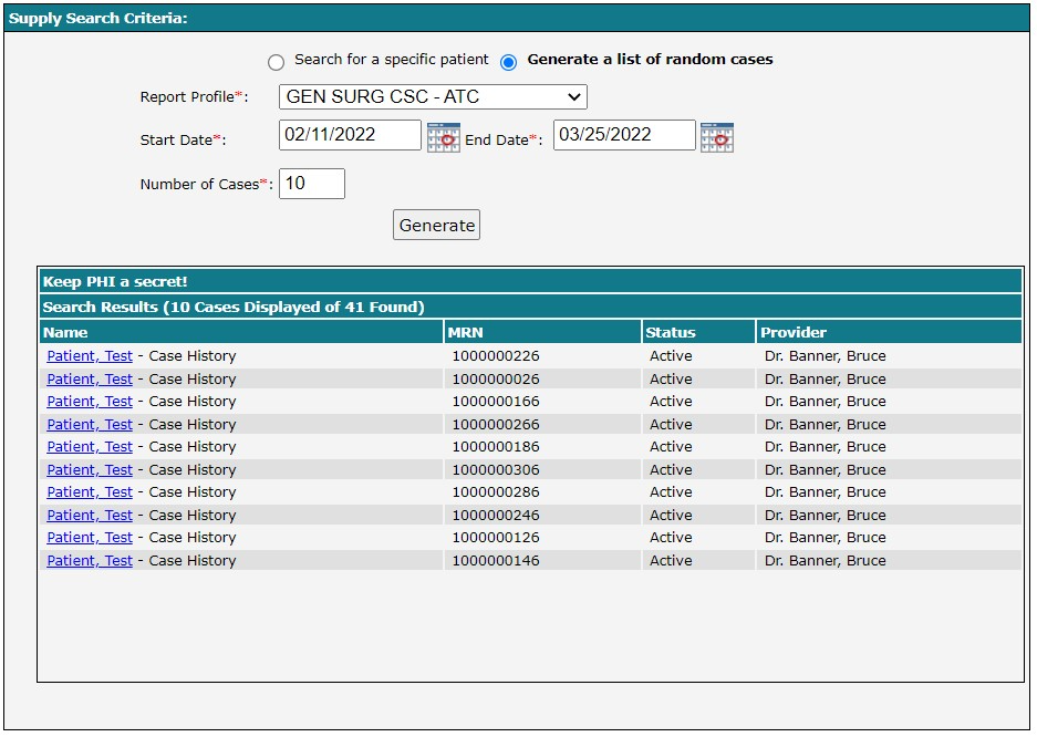 This report displays which users have accessed a patient, or a random list of cases, to see which users have viewed a patient to monitor for any inappropriate use of Novari ATC.