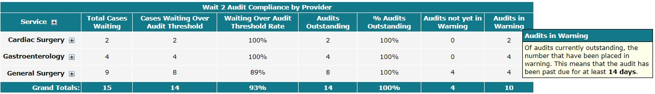 The Wait 2 Audit Compliance by Provider report displays providers by service and their compliance with Wait 2 audit requirements.