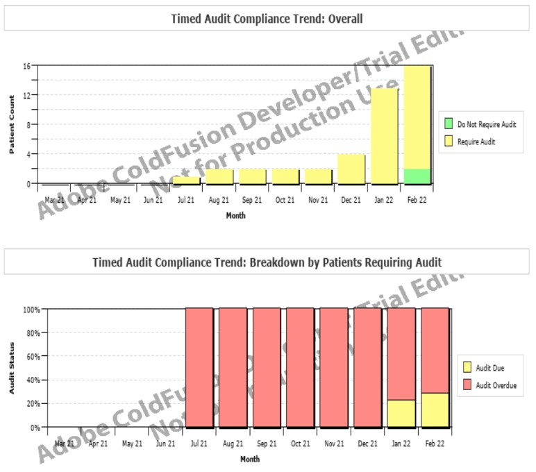 The Wait 2 Audit Compliance Trend report displays the compliance trend over time. The first chart shows the number of patients who need audits versus the number that don’t over time. The second chart shows the audit due versus audit overdue over time.