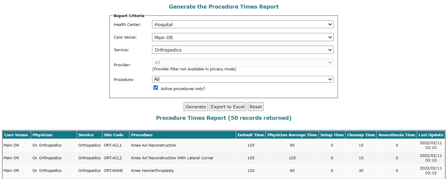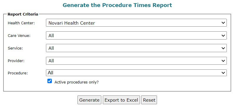 To generate the Procedure Times report: