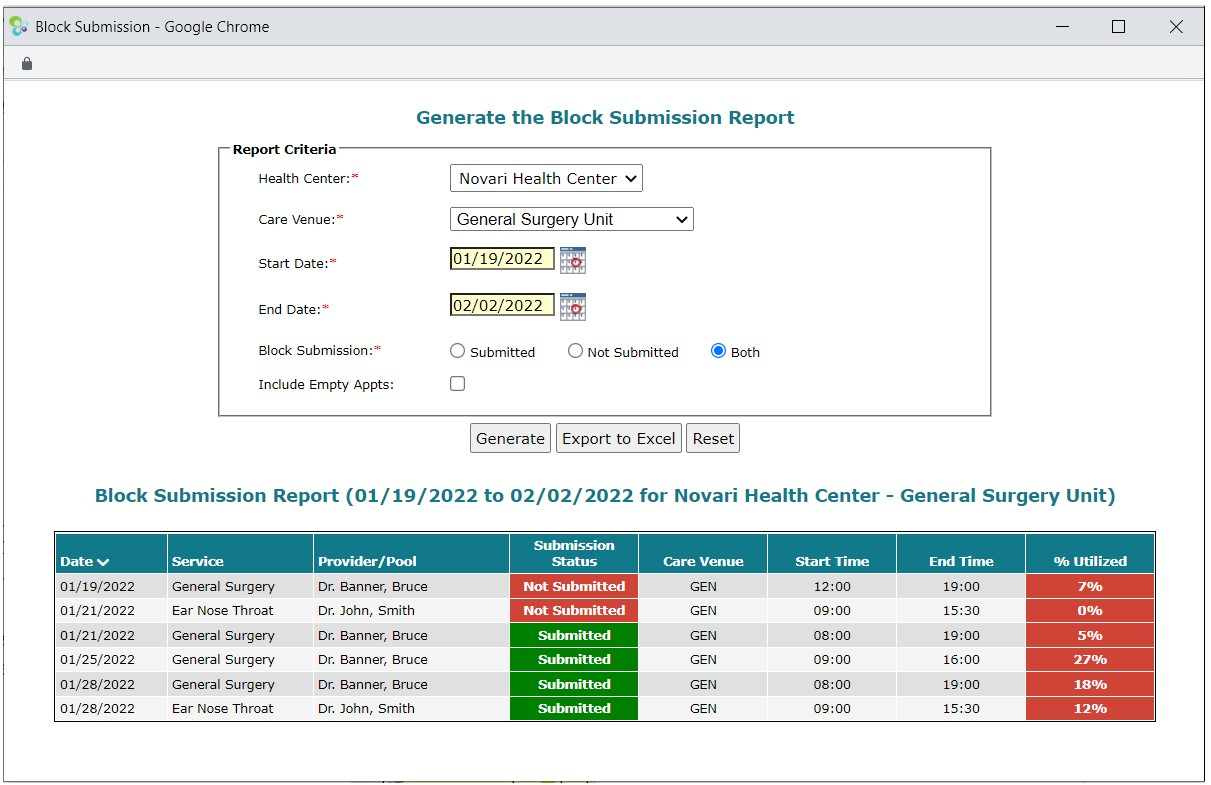 This is the same report that is available to Care Venue users. Use it to monitor the timeliness of block submissions.