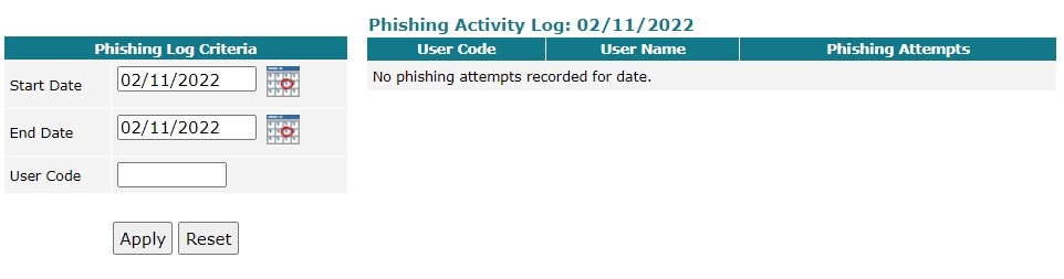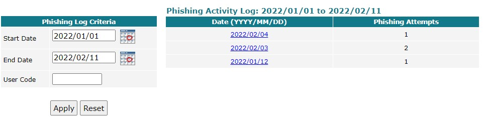 For example, you can look for phishing attempts over a date range. If there have been any, click on the date to see who made phishing attempts on that day. Or you could enter a date range and a user code to see if that specific user had attempted to phish for patient information.