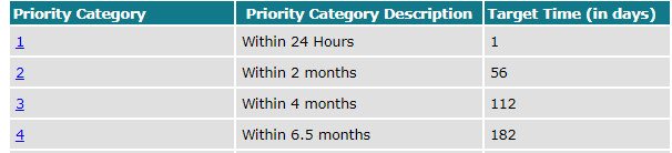 Below are the standard priority categories. Notice each priority category is assigned a date range. This allows for cases with various priority codes, as described above, with similar target timeframes to be grouped and summarized. Using the example below, any case with target times between 1 and 56 days, regardless of its priority code, will be grouped in Priority Category 2.