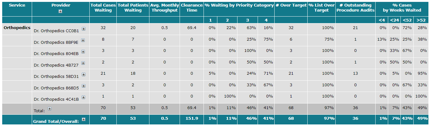 Priority categories are used to summarize wait time reporting. It is impossible to create meaningful rollup reports using priority codes because the wait time for one procedure with priority 2 may be totally different from the wait time for another procedure with priority 2. For example, vitrectomy. It has a priority 2 with a target of 7 days. An ortho hip or knee priority 2 has a target of 42 days, which is equal to a priority 3 vitrectomy. This means they should both be of the same urgency: a P3 vitrectomy = 42 and a P2 hip/knee = 42 days. Corneal transplant is another good example. A priority 2 for Corneal Transplant is within 4 weeks. However, a Glaucoma priority 2 is within 2 weeks.