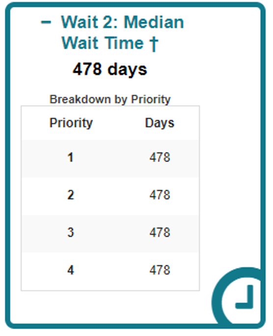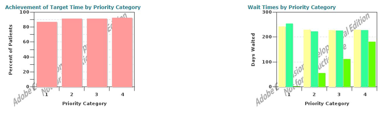 The Procedure Profile report utilizes the priority categories in the two bar charts (the bright neon green, the right most bars in the Wait Times by Priority Category chart are the exact priority category target times of 1, 56, 112, and 182) – this is for Wait 2.