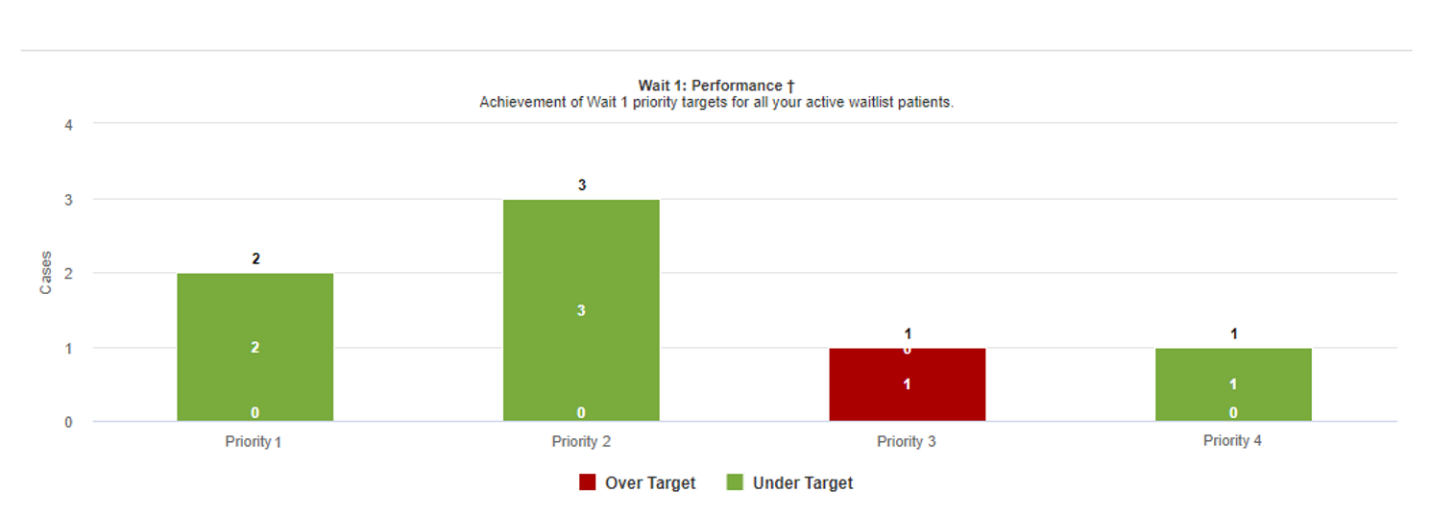 For the Wait 1 Performance chart, the priority groupings are by priority category. Having mismatching priority categories for oncology vs. non-oncology will show eight different categories; they are specifically grouped based on the “Priority Category” field.