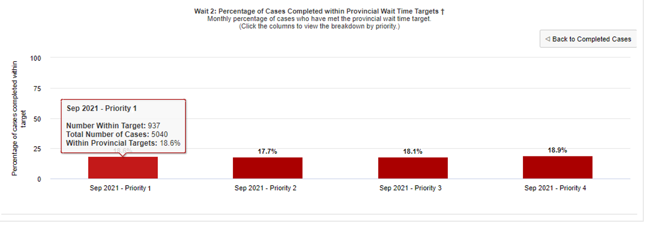 For the Wait 2 Percentages of Cases Completed within Targets chart, clicking on a specific month, we see the breakdown by priority category. This is categorized based on the “Priority Category”, so incorrect/different naming schemes will separate these out in reports.