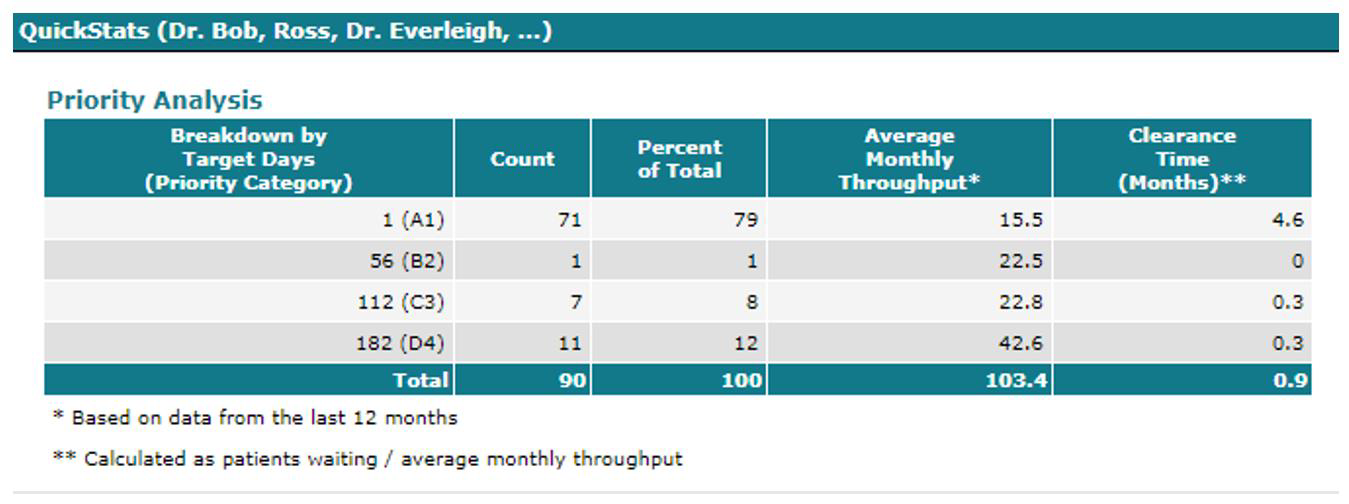 The Priority Analysis on the QuickStats report uses and shows the target times and the procedure category in the left column (this is only for Wait 2).