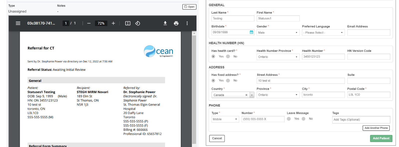 The name of the referring provider appears in the inbox. Proceed with the processing steps as you would for faxes. If the referring provider exists in Novari, their name will automatically fill in the requester field.