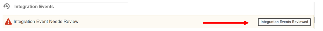To the right of the Integration Events section is the Integration Events Reviewed action button. When clicked it will clear the event(s) and removes the exclamation mark from the History tab and the action button will disappear, but the failures remain in red. If you have any dashboard buckets configured to pull back referrals with failures this will remove them from the bucket