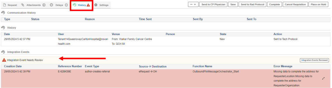 Integration events are part of the referral history to flag to the user that a failure occurred. When an integration message has failed the referral History tab will show a red exclamation mark on the history tab to inform the user of the failure.